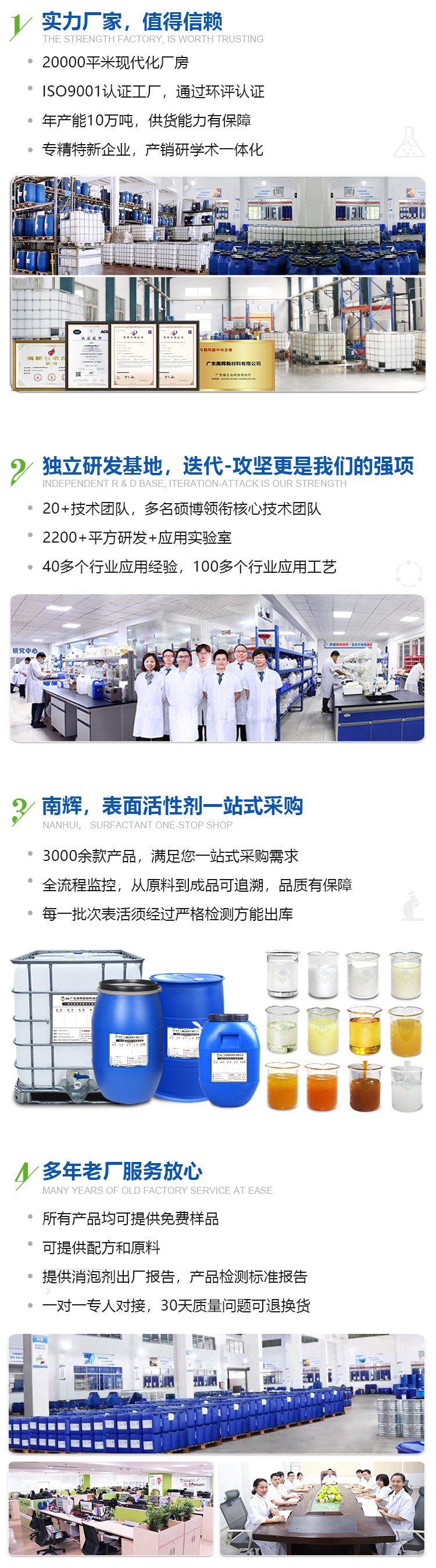 廣東南輝新材料有限公司,是一家致力于表面活性劑研發(fā)、生產(chǎn)、銷售為一體的國家高新技術(shù)企業(yè),擁有獨立的研發(fā)基地,主要研發(fā)產(chǎn)品有:乳化劑、滲透劑、勻染劑、司盤、吐溫、消泡劑等3000余款產(chǎn)品。南輝擁有20000平方米的現(xiàn)代化生產(chǎn)車間,年產(chǎn)能可達10萬噸。通過ISO9001:2015質(zhì)量管理體系認證,已獲得十余項不同產(chǎn)品的發(fā)明專利授權(quán),被評為廣東省"專精特新"企業(yè)。從2018年開始批量出口至俄羅斯、日本、馬來西亞、印度、秘魯?shù)葒遥殉蔀閲鴥?nèi)目前主要的表面活性劑生產(chǎn)廠家。